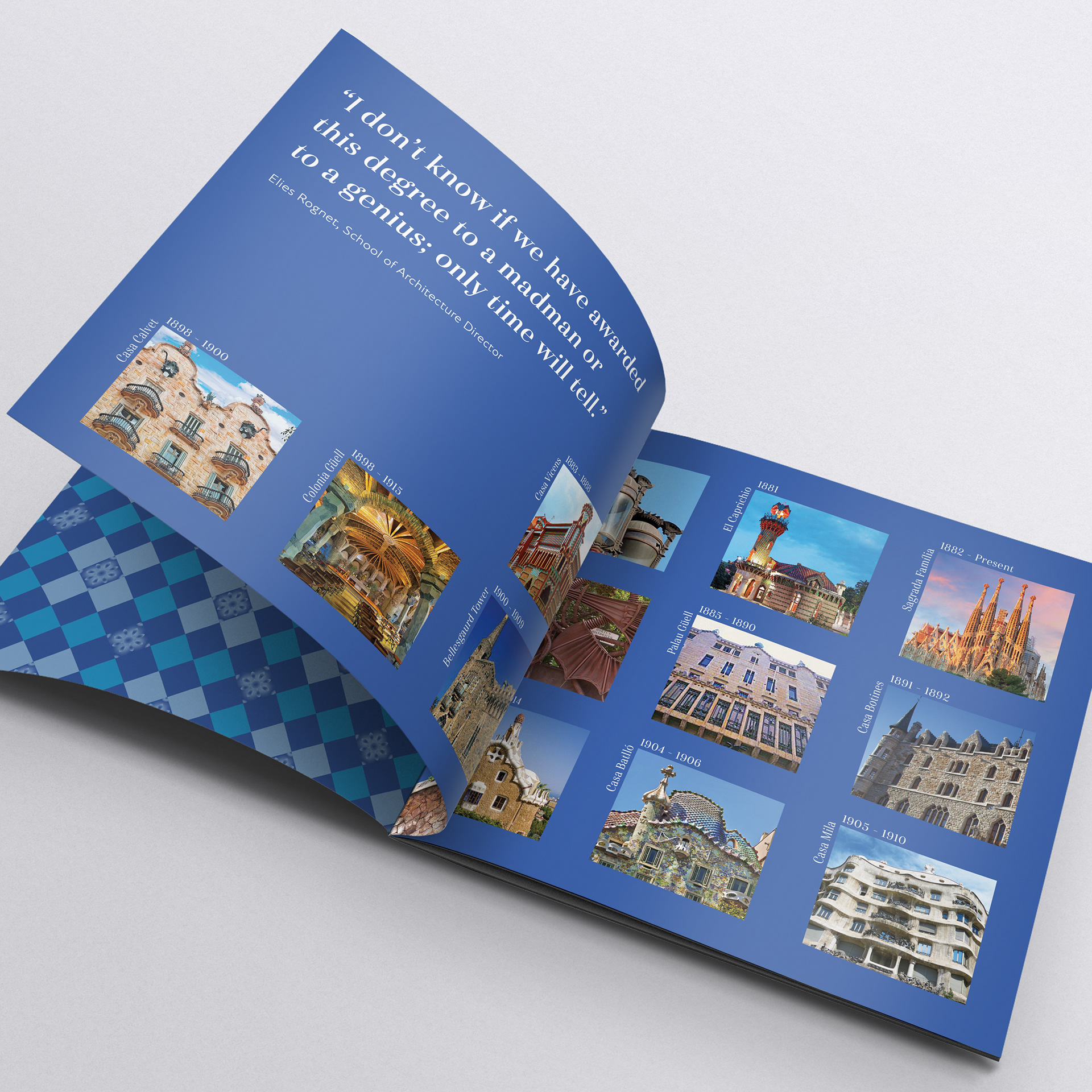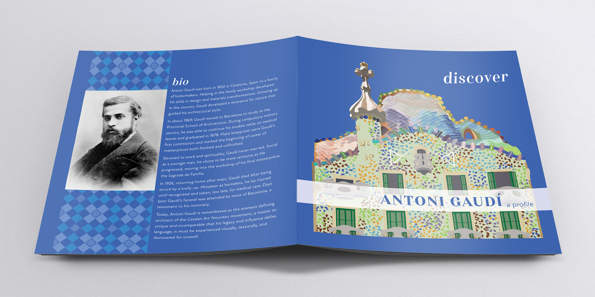 A project conceptualized to share concisely the life of a design inspiration through concise copy, bold patterns & color, and targeted photos.